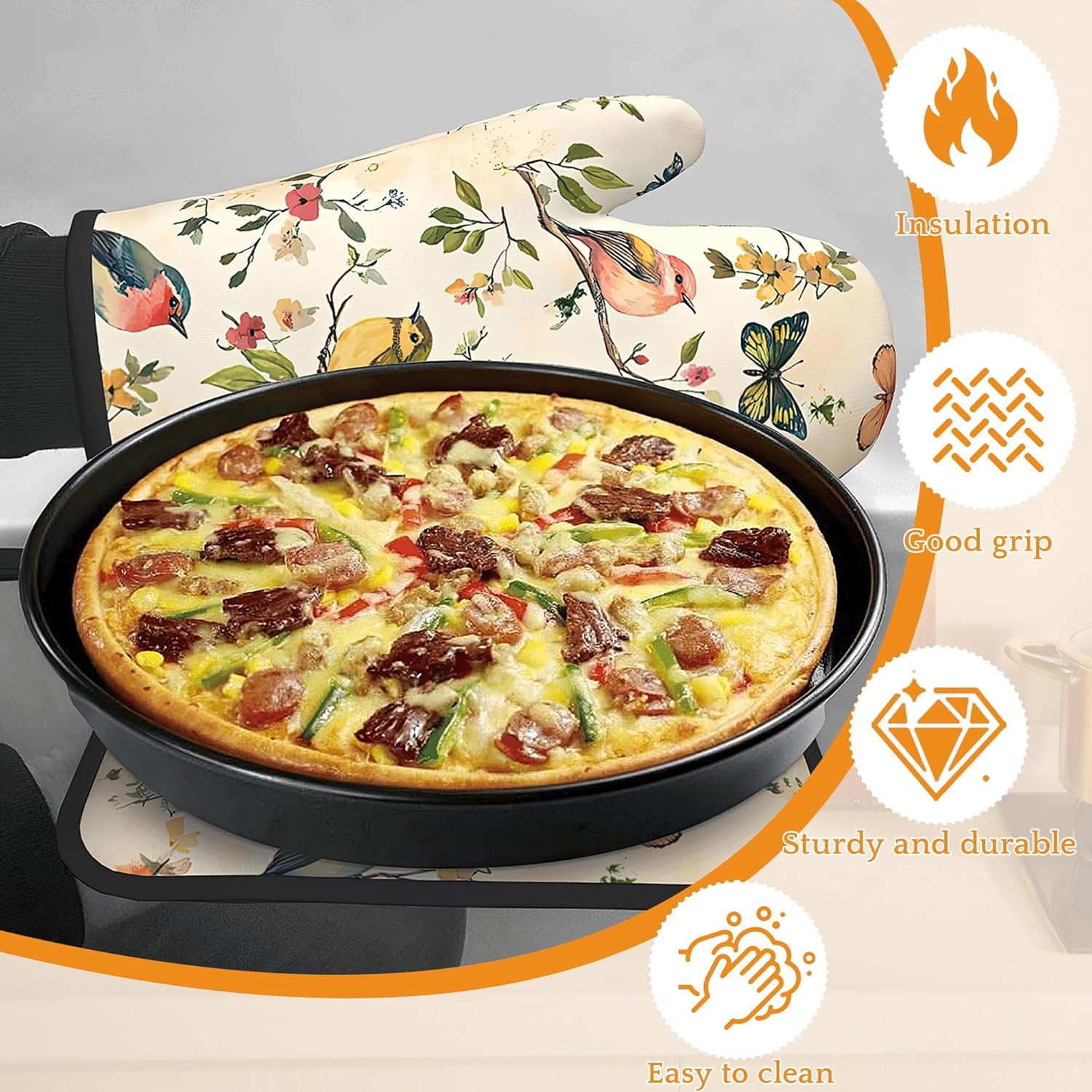 Vintage Butterfly Bird Oven Mitts and Pot Holders Set,Floral Flower Kitchen Oven Gloves and Pot Holder with Heat Resistant Non Slip for Cooking Baking Grilling(4 Piece Set)
