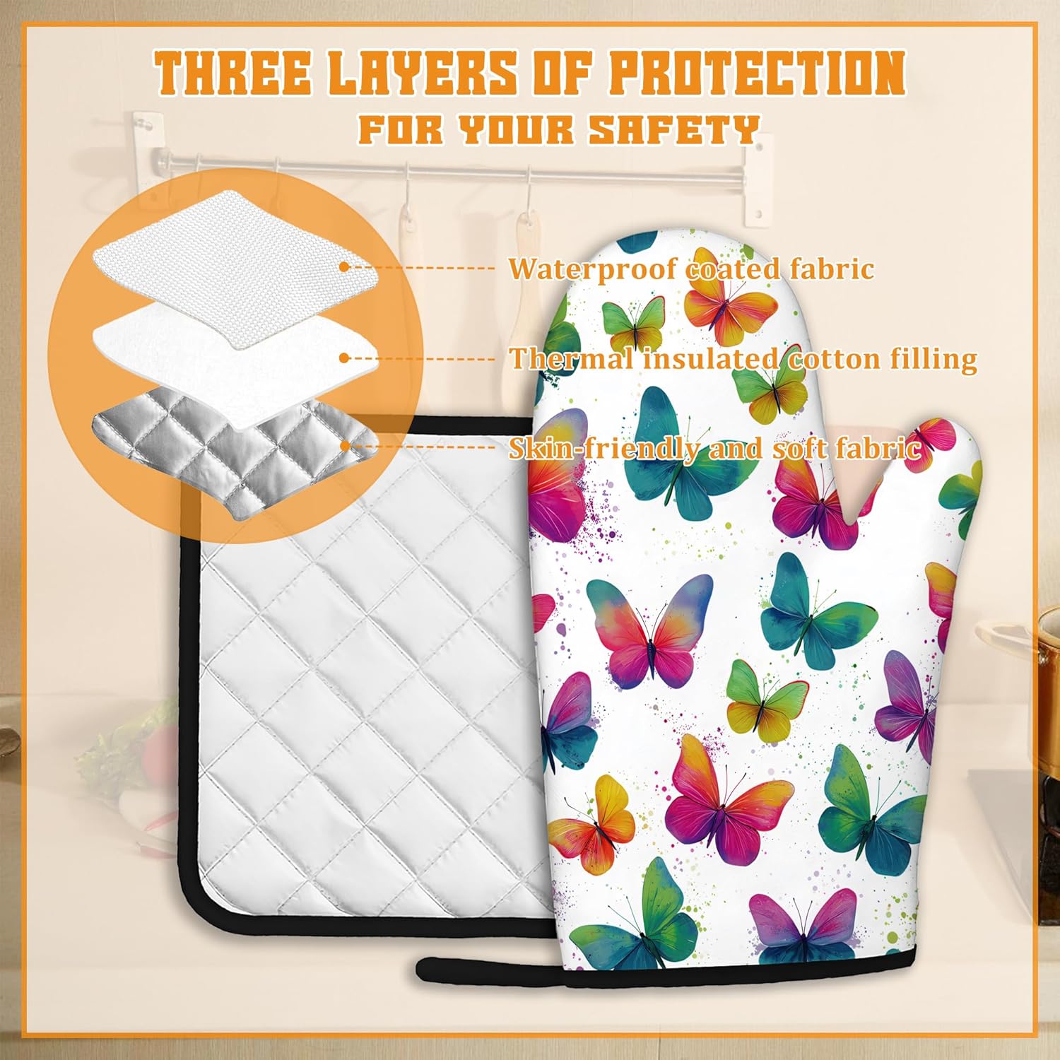 Colorful Butterfly Oven Mitts and Pot Holders,Heat Resistant Oven Mitts Gloves and Pot Holder for Home Kitchen Decorations Cooking Baking BBQ Gifts,Set of 4