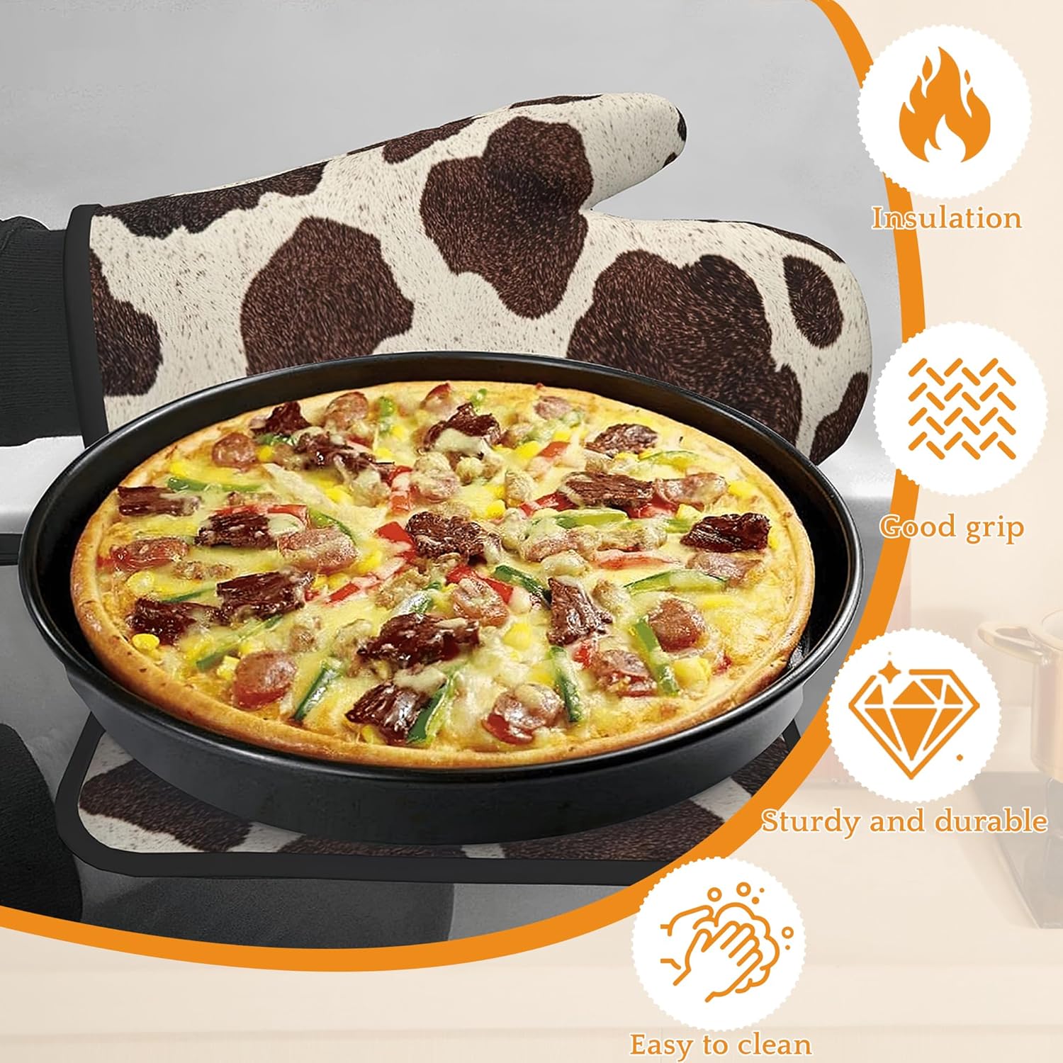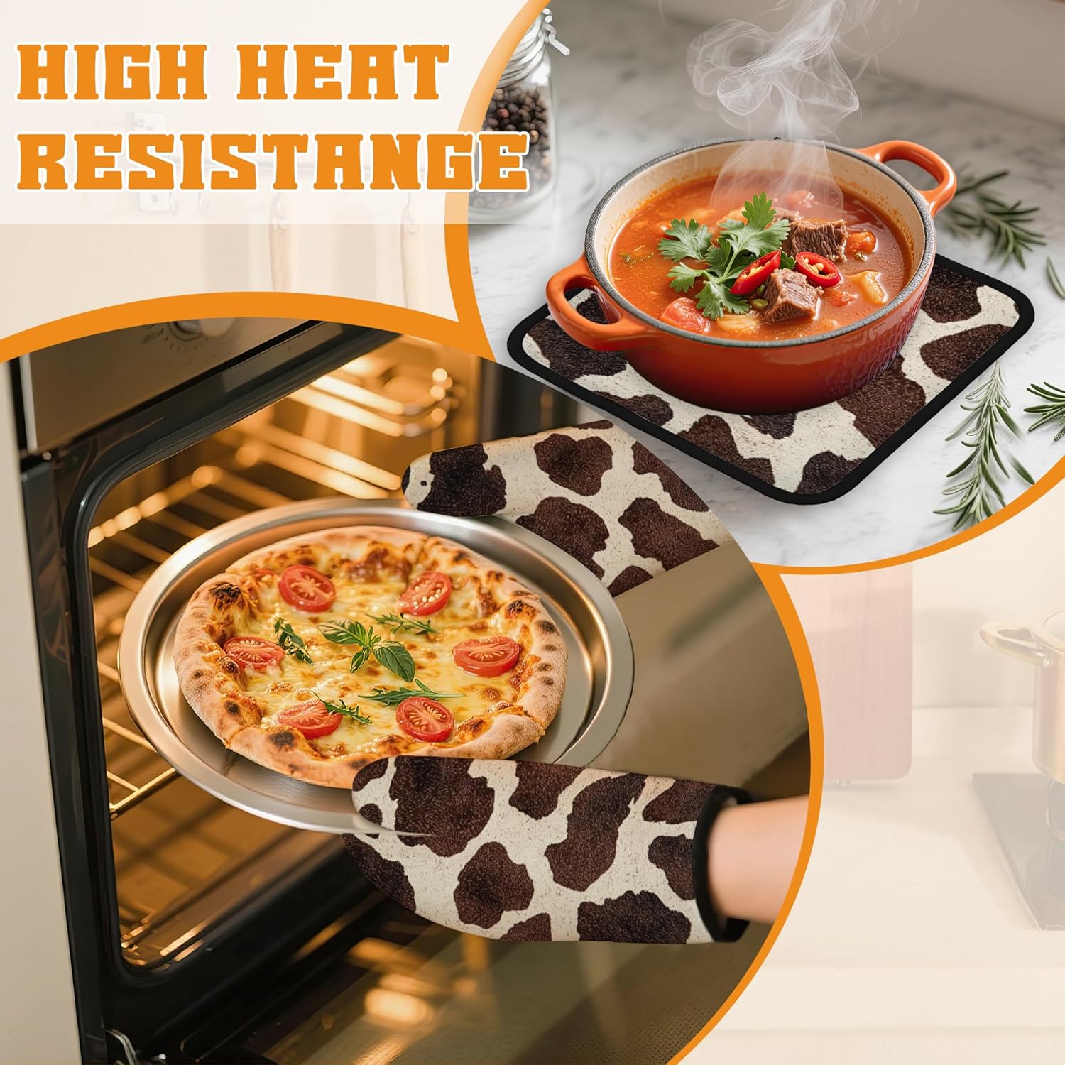 Brown Cowhide Oven Mitts and Pot Holders,Cow Skin Heat Resistant Oven Mitts Gloves and Pot Holder for Home Kitchen Decorations Cooking Baking BBQ Gifts,Set of 4