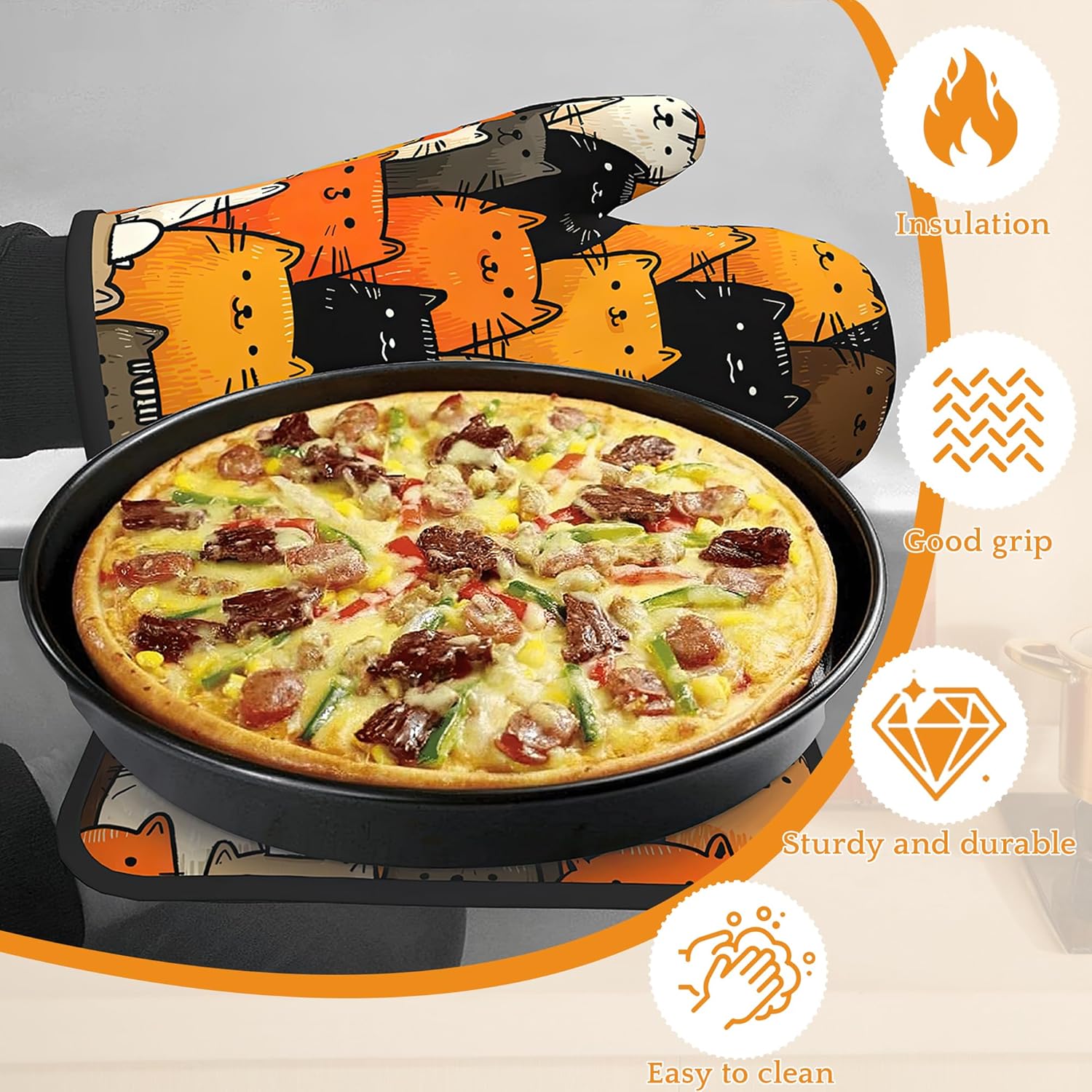 Funny Cute Cat Oven Mitts and Pot Holders Set,Kitchen Decor Heat Resistant Non Slip Hot Pads and Oven Mitt for Chef Cooking Baking BBQ Mom Girl Gifts(4 Piece Set)