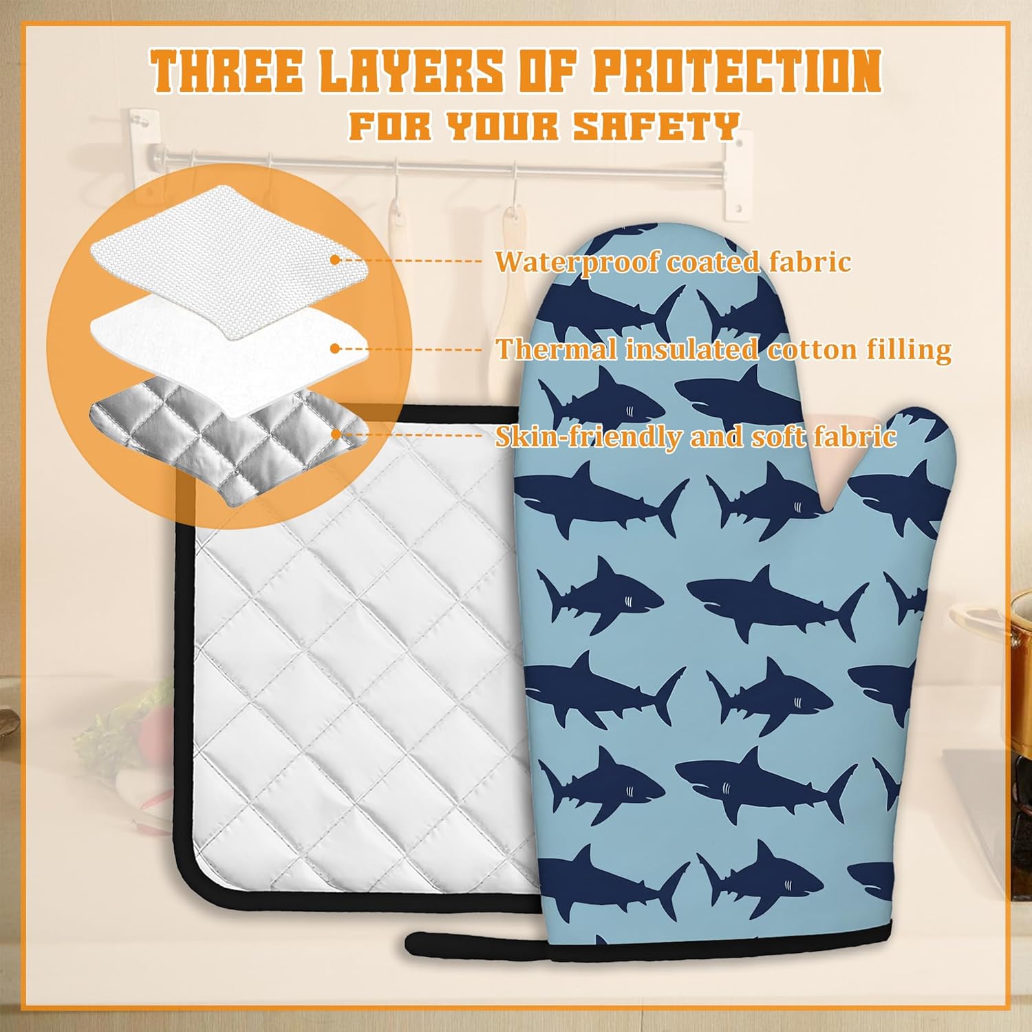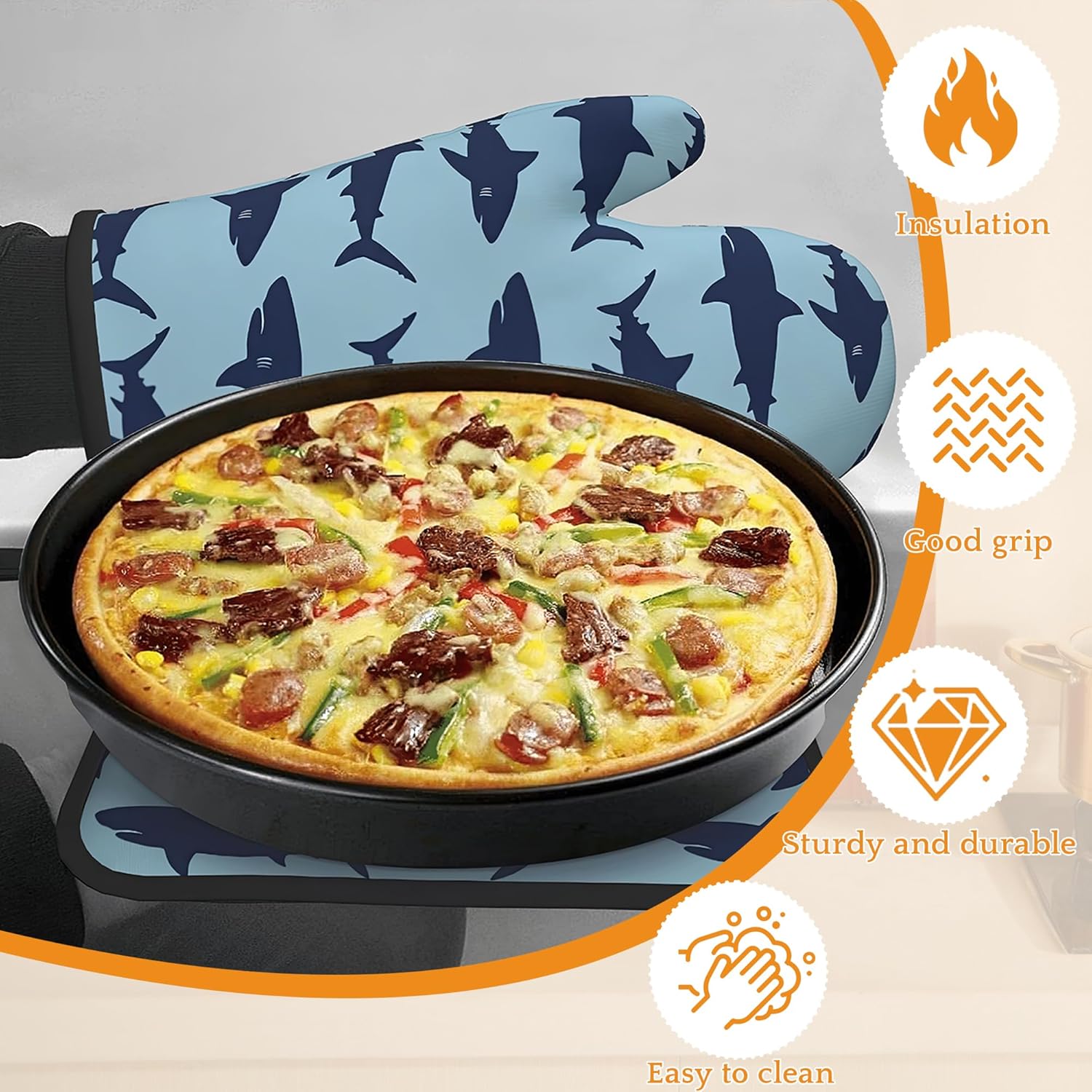 Blue Shark Oven Mitts and Pot Holders,Heat Resistant Oven Mitts Gloves and Pot Holder for Home Kitchen Decorations Cooking Baking BBQ Gifts,Set of 4