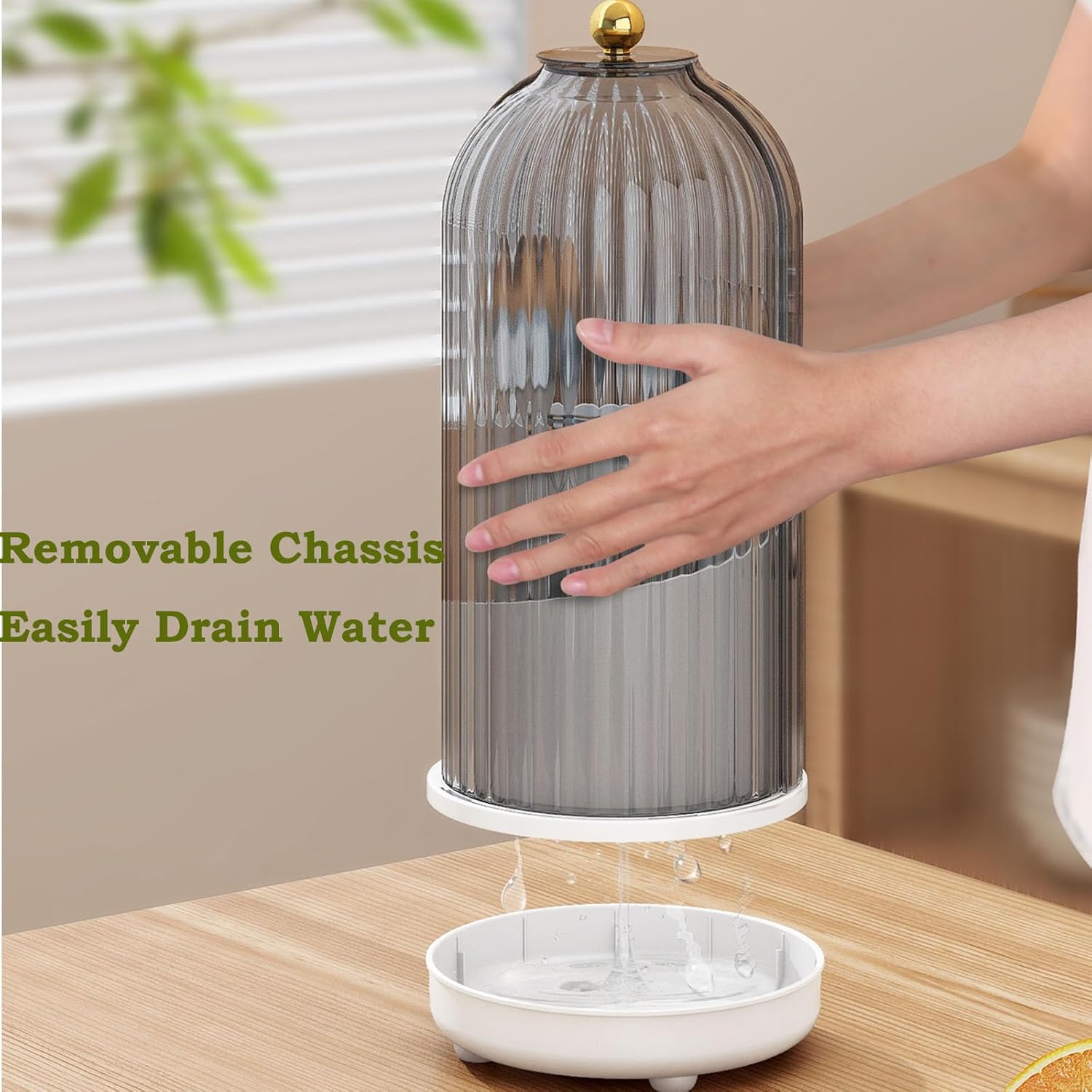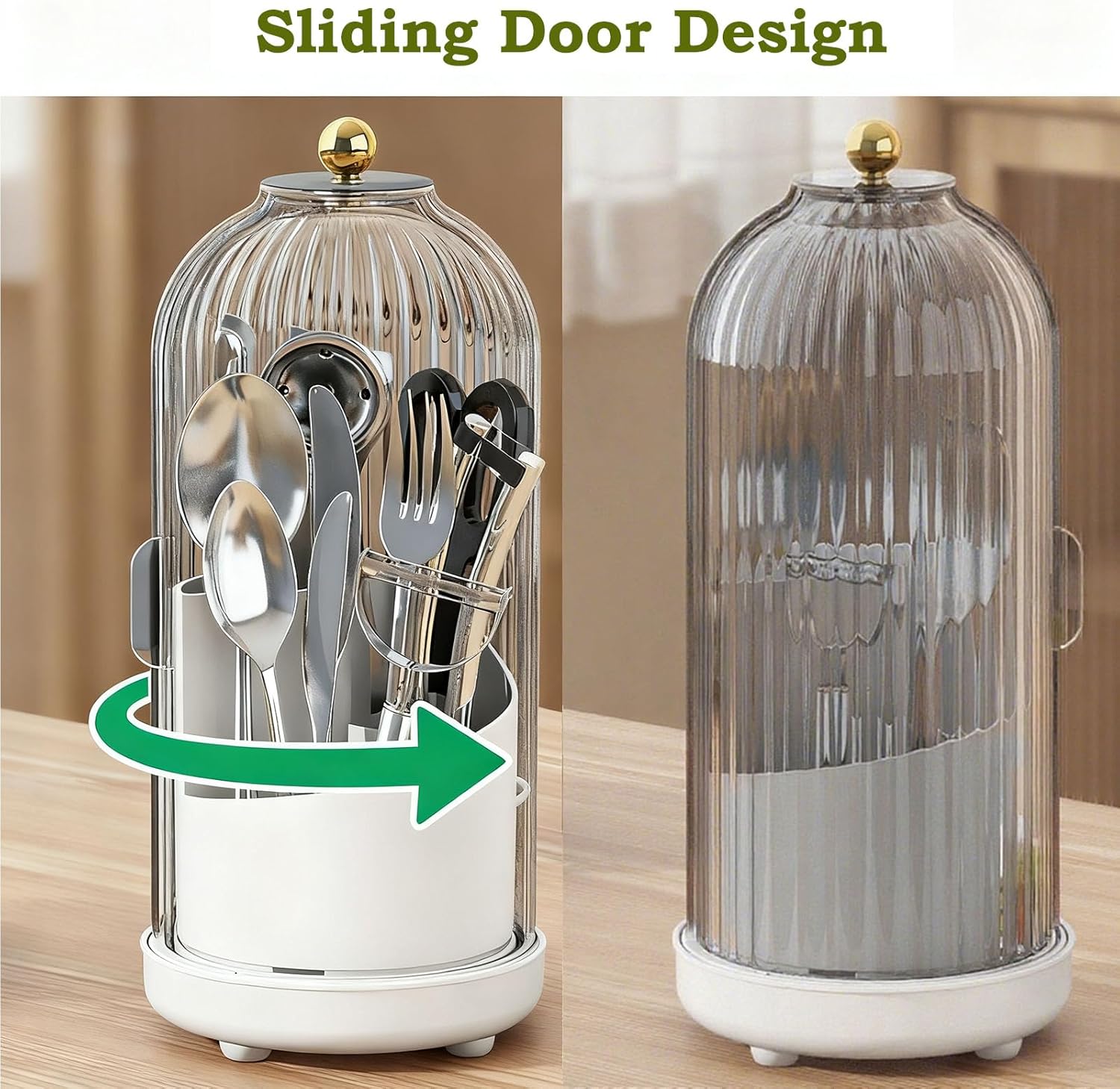 JEESA Utensil Holder with Lid, 360° Rotating Flatware Organizer for Cutlery Spoon Fork(H Less 8"), Silverware Caddy Organizer Drainage Dustproof Flatware Holder Kitchen Countertop Storage, Gray
