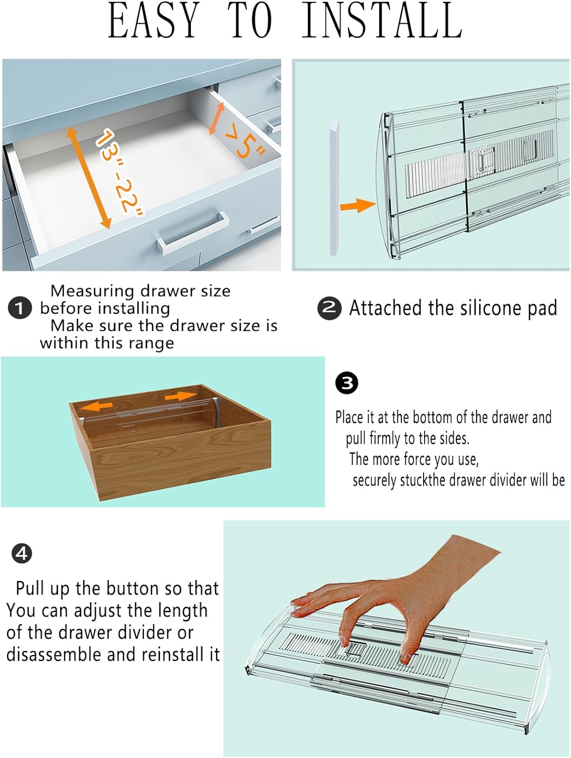 - 2:Easy to Use--1: Attached the silicone pad(Protect drawers from damage) 2:Place it at the bottom of the drawer and pull it forcefully on both sides. The harder you apply, Drawer Dividers Organizer the more firmly stand.