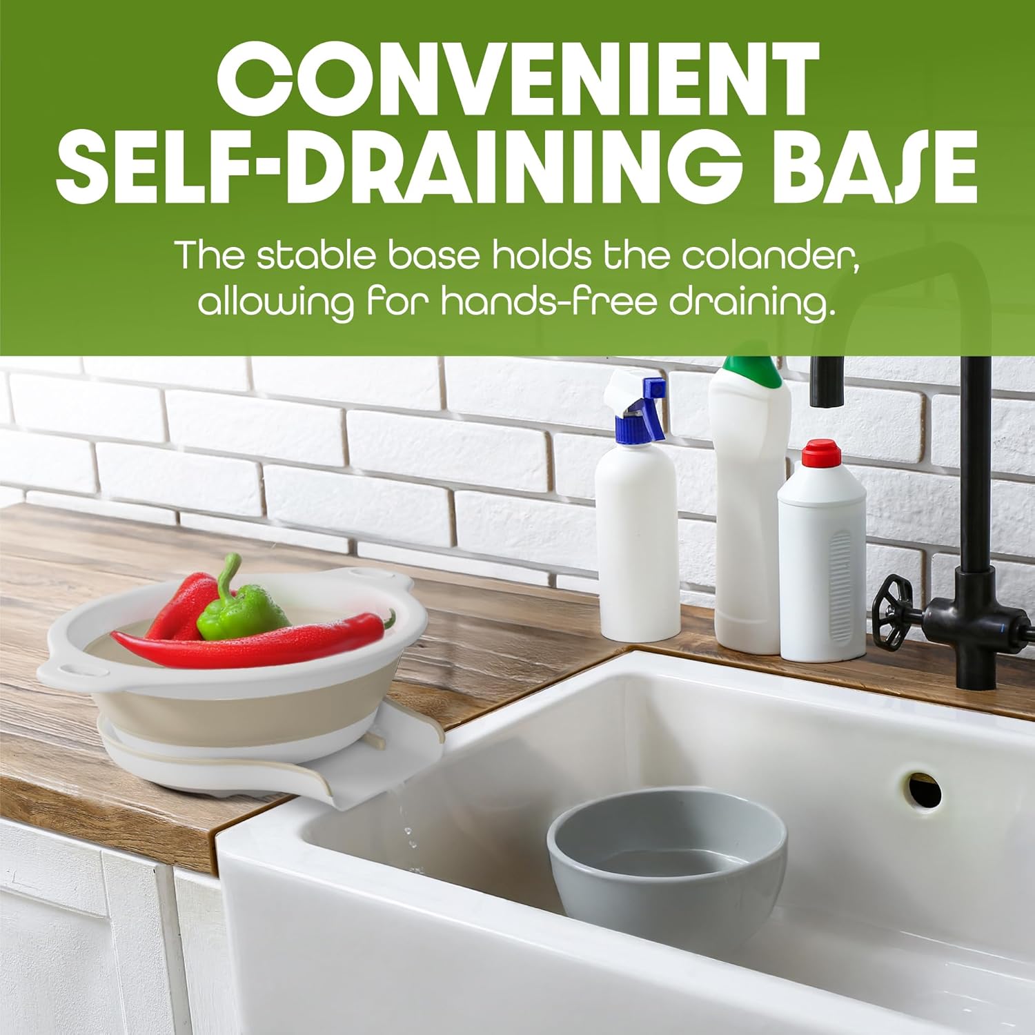 - This set of 2 collapsible colanders features an innovative self-draining base that allows water to drain directly into your sink, even when it's full.