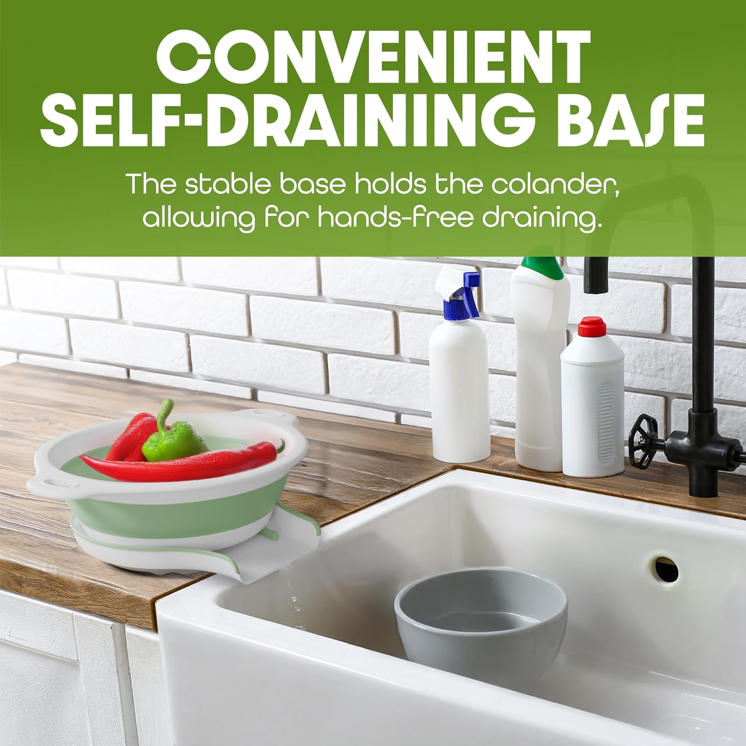 - This set of 2 collapsible colanders features an innovative self-draining base that allows water to drain directly into your sink, even when it's full.