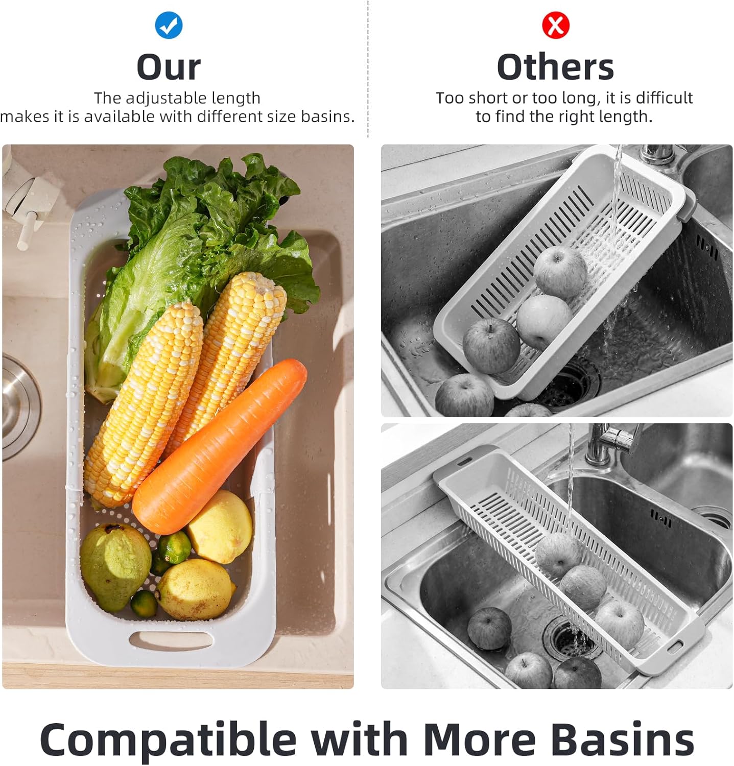 - 【Superior Stability and Capacity】Unlike standard colanders, our innovative sink colander design features wider handles that securely extend from 14.5 to 19.3 inches to fit sinks from 11 to 16 inches. The colanders & food strainers has deeper 3.2-inch basin provides a larger capacity, allowing you to drain more food at once without worrying about spillage. This thoughtful design ensures stability and convenience for all your cooking needs.