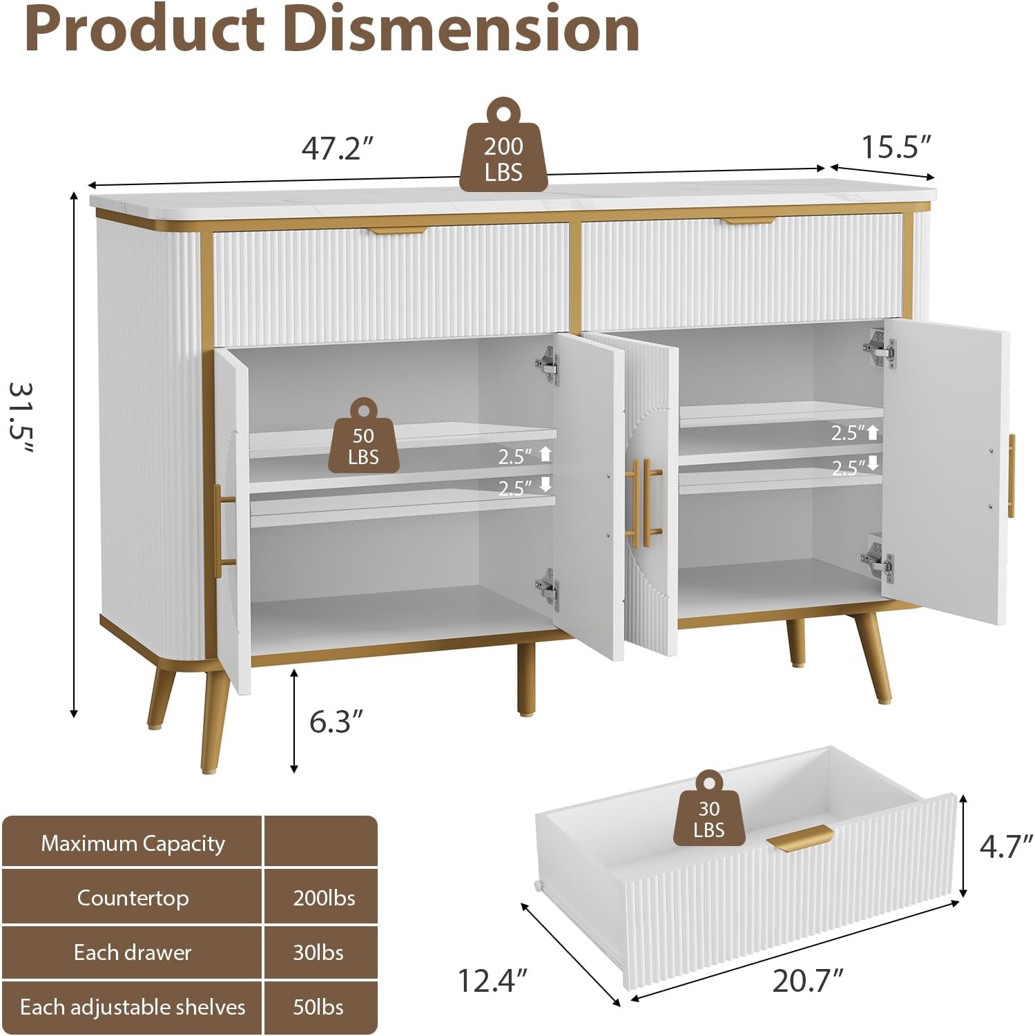 - Durable & Stable construction—Adapting solid high-grade engineered materials, the buffet sideboard cabinet can safely support up to 200 lbs, ensuring your belongings are stored securely. The countertop is scratch-resistant and waterproof, effortlessly withstanding daily wear and stains. Additionally, the reinforced splayed legs provide ample space for the robot vacuum to clean, helping your room stay clean and tidy daily!