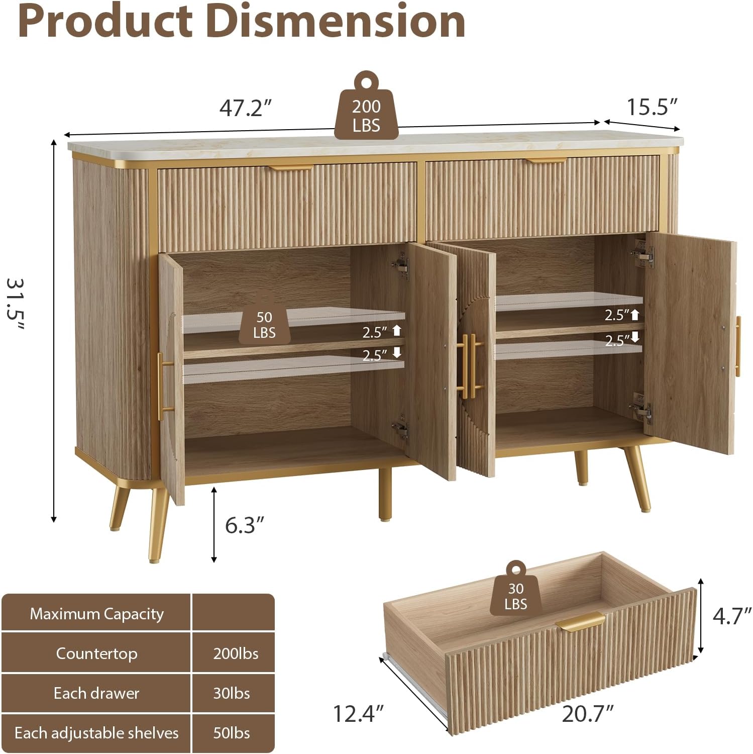 47.2" Buffet Storage Cabinet, Modern Fluted Coffee Bar Station with 2 Drawers & Adjustable Shelves, Kitchen Sideboard Buffet for Dining Room, Living Room, Hallway, Natural Oak