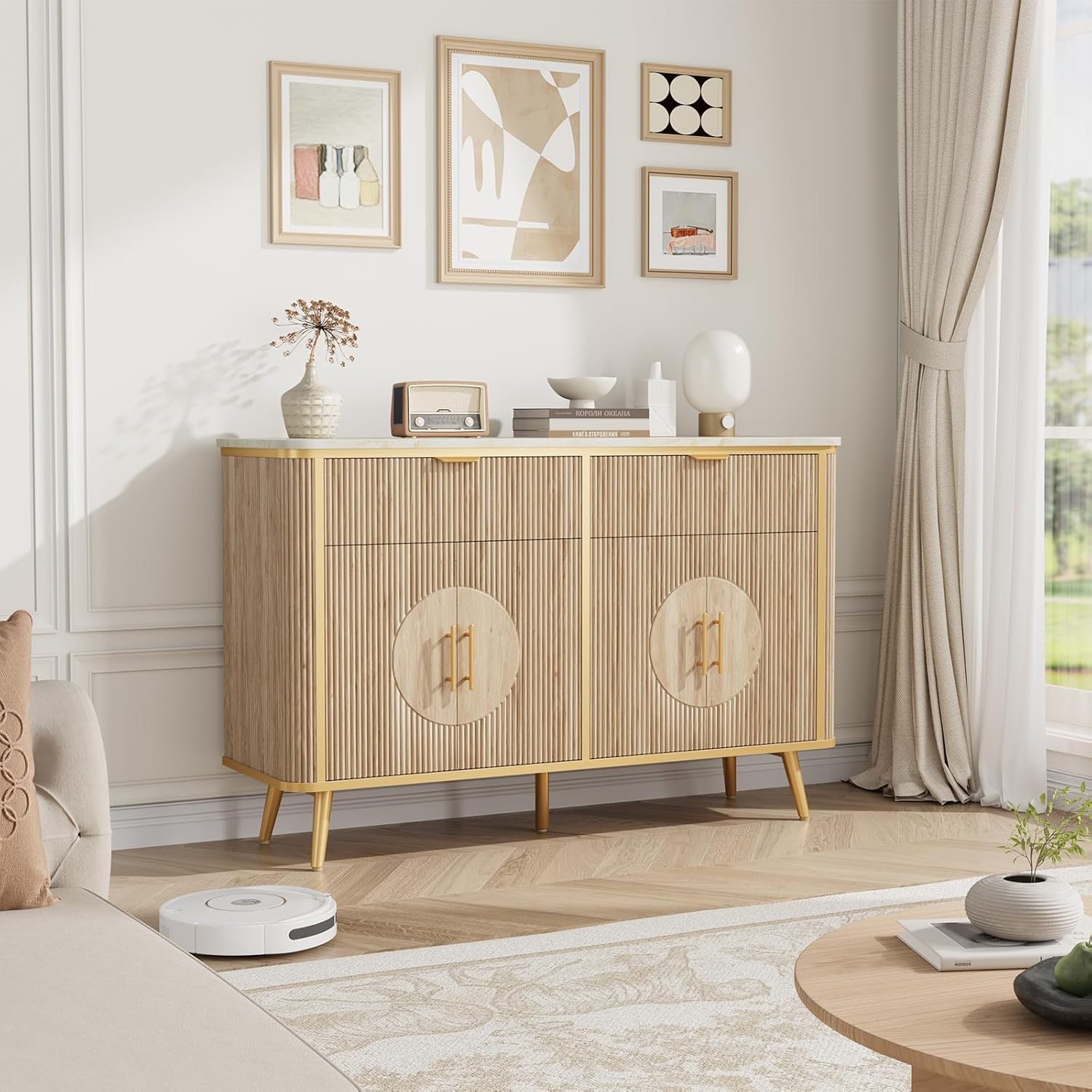 - Modern Fluted Striped Design—This chic sideboard features a unique fluted panel and curved contour design, enhancing a stereo feeling with striking geometric lines. Its exquisite designed polished and frosted handles are matched with the marble-textured finish countertop, which combines modern aesthetics with natural style, adding a touch of fashion and luxury to the room.