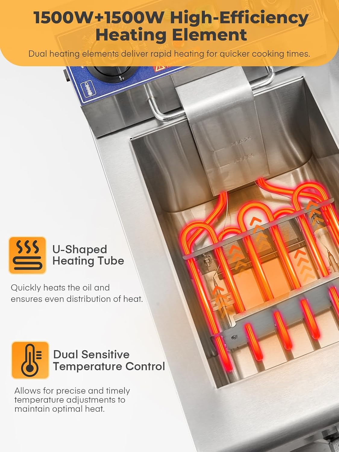 - 【Temp & Time Control】: 1500W+1500W dual-tank deep fryer with basket offers outstanding heating performance, efficiently providing delicious fried food for multiple people and reducing wait times. It comes with precise temperature control and a timer function, allowing you to easily adjust the oil temperature (140°F-392°F) and control the frying time, ensuring food is crispy and juicy. NOTE: This deep fryer will automatically shut off when the temperature exceeds 392°F (200°C).