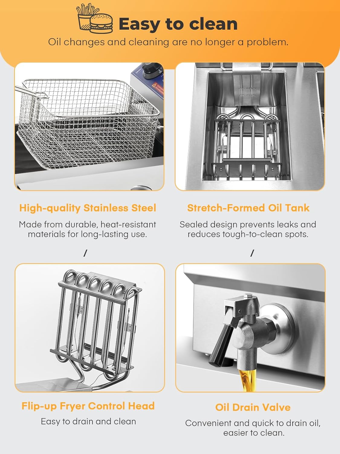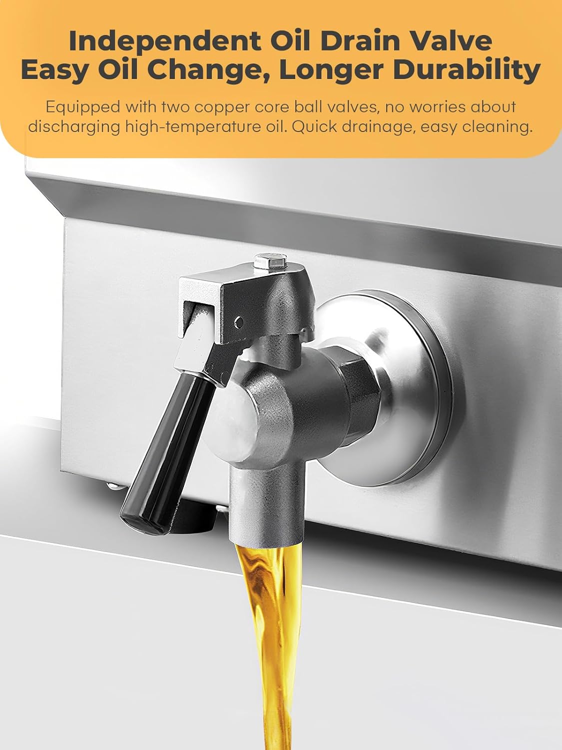 - 【Practical Oil Drain Valve Design】: The commercial deep fryer's unique oil valve design allows for easy oil draining through two valves, simplifying oil handling and reducing cleanup. This makes it easy to keep your kitchen tidy. Note: Keep the oil level above the minimum oil level line and below the maximum oil level line during use. Be careful not to splash oil during operation.